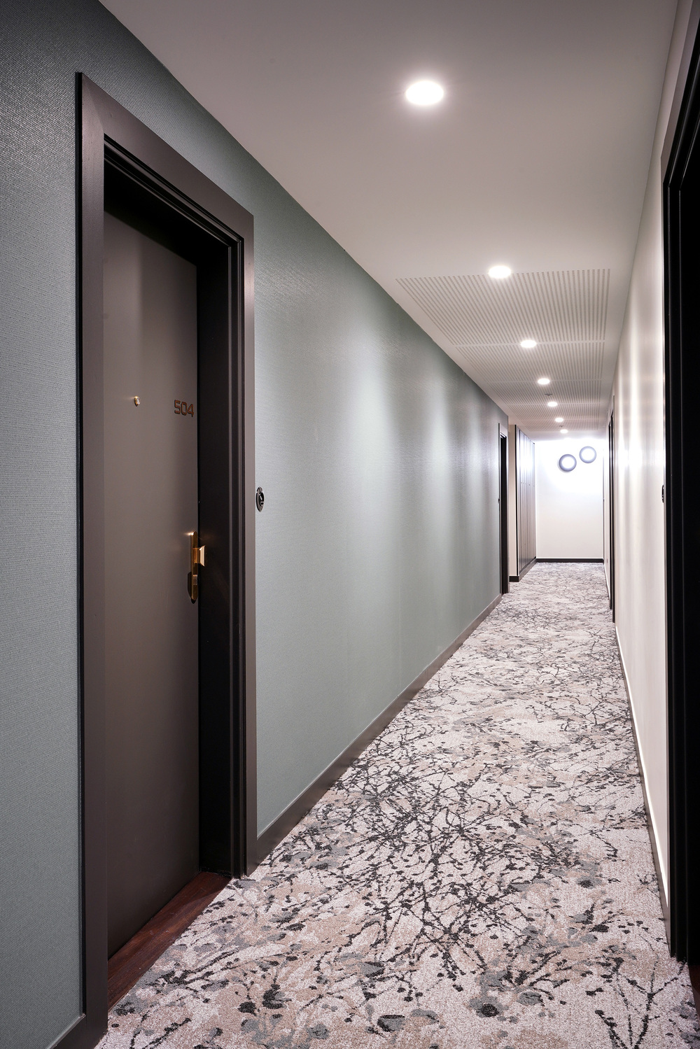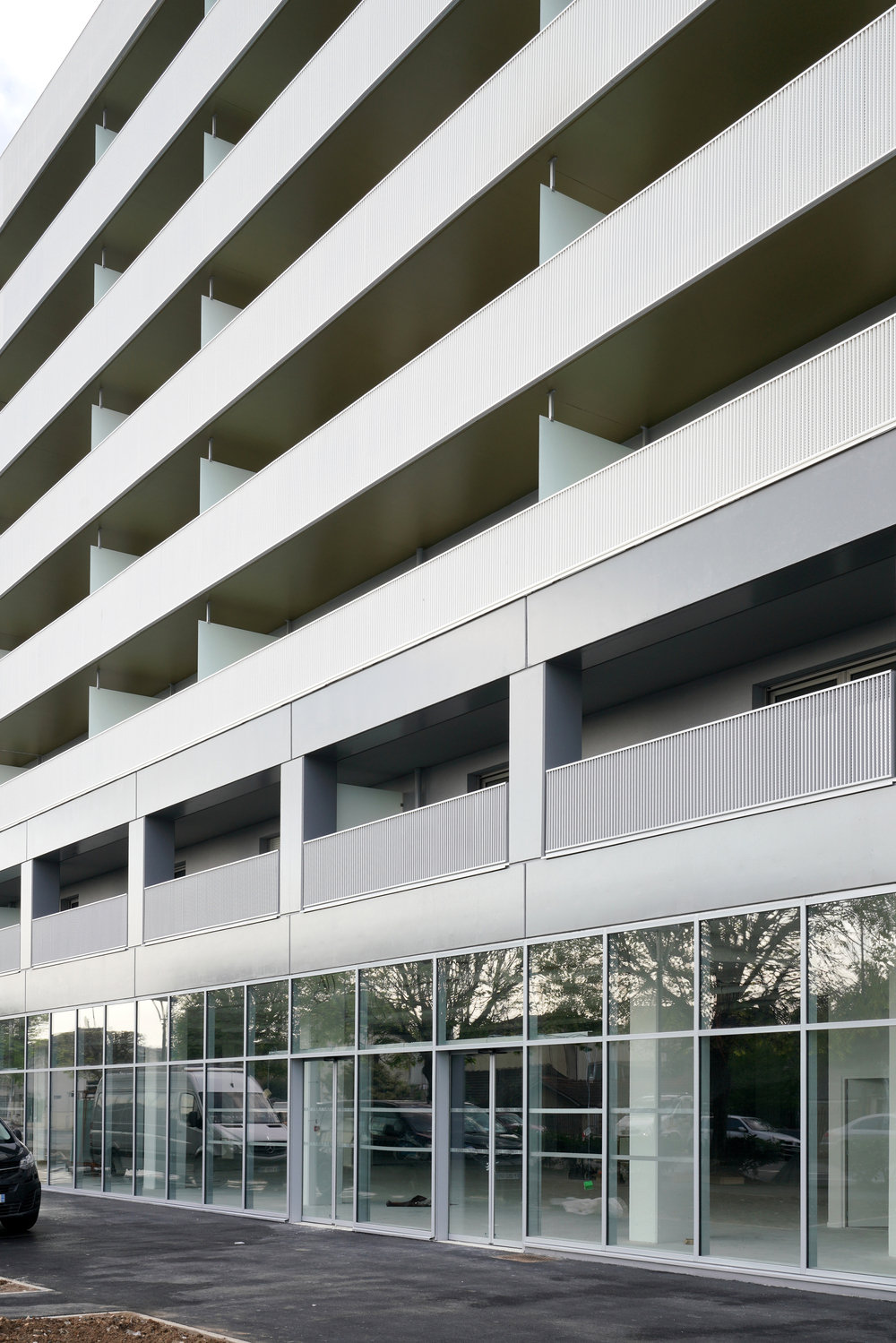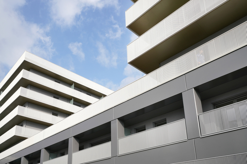 La résidence présente une silhouette élégante, rythmée par des balcons filants, rehaussés avec légèreté par des garde-corps en métal perforé de couleur blanche. Elle affirme sa personnalité à travers son architecture dans ce paysage citadin.