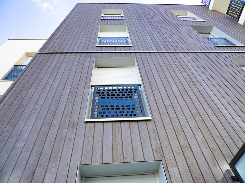 Les volumes qui s’en décrochent sont accentués par le contraste d’un enduit de ton pierre claire ou marron soutenu, dialoguant avec des séquences en bardage bois écocertifié. Plusieurs types de garde-corps, dont certains en verre translucide côté parc, confortent la variété de traitement des façades et des différentes ambiances.